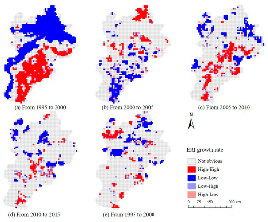 Hotspot Analysis of Growth Rate of ERI from 1995 to 2019 ((a) Results of growth rate of ERI hotspot analysis from 1995 to 2000, (b) Results from 2000 to 2005, (c) Results from 2005 to 2010, (d) Results from 2010 to 2015, (e) Results from 2015 to 2019).
