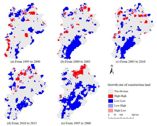 Hotspot Analysis of Growth Rate of CL Area from 1995 to 2019. ((a) Results of growth rate of CL area hotspot analysis from 1995 to 2000, (b) Results from 2000 to 2005, (c) Results from 2005 to 2010, (d) Results from 2010 to 2015, (e) Results from 2015 to 2019).