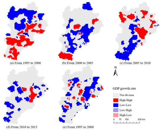 Hotspot Analysis of GDP Growth Rate from 1995 to 2019. ((a) Results of growth rate of GDP hotspot analysis from 1995 to 2000, (b) Results from 2000 to 2005, (c) Results from 2005 to 2010, (d) Results from 2010 to 2015, (e) Results from 2015 to 2019).