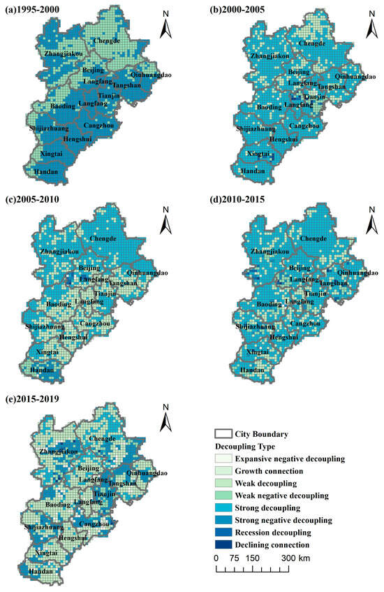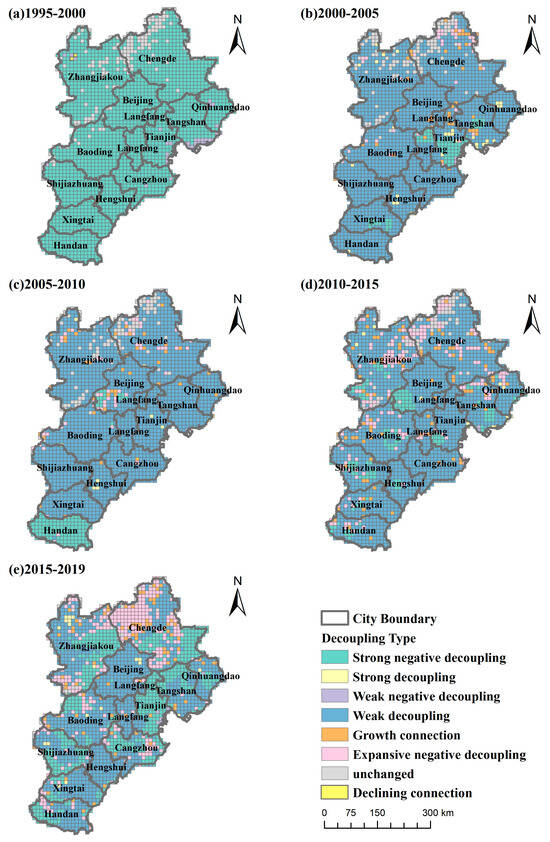 Spatial Distribution of Decoupling between ERI and EG from 1995 to 2019. ((a) Results of ERI and EG decoupling from 1995 to 2000, (b) Results from 2000 to 2005, (c) Results from 2005 to 2010, (d) Results from 2010 to 2015, (e) Results from 2015 to 2019).