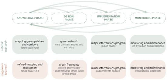 Following the approach of the design phase, the most common current practice consists of major interventions which, due to space and investment requirements, affect almost exclusively the public space. While it is true that minor interventions also exist, these generally lie outside the strategic planning of UGI. Minor green projects are neither planned as part of the UGI nor registered by urban ecological mapping, although they certainly offer local benefits []. The green fragments approach implies a significant reduction in the scale of interventions and an increase in their number. What remains from the network approach is the systemic vision and the subordination of specific design choices to common principles and objectives. It is essential that the implementation of principles remain clearly and unambiguously defined and that fragmentation only pertains to the physical scale of implementation. The reduction in scale possibly also leads to a change in ownership of both the areas that host existing green fragments and those that constitute potential expansion areas. While the green network relies mostly on public space, this approach pushes in the direction of greater blending between public and private engagement. Consequently, while the implementation of patches and corridors is fundamentally a public initiative, private entities take on a primary role for the realization of new green fragments, with coordination and support being provided by the public planning authority. This phase can beneficially incorporate co-design procedures [] and community engagement in the UGI planning processes [].
