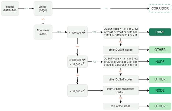 As described in the previous sections, a major difference between the green network and the green fragments is the scale. For this reason, it is crucial to define protocols for the identification of the structuring elements of the UGI, in accordance with the principles introduced in Section 2. Referring to the concept of green networks, existing protocols can be applied to identify the main components (patches and corridors) of the urban green matrix, such as the one proposed by Delgado-Capel and Cariñanos []. Their framework takes spatial distribution, extension, and the capacity to improve inhabitants’ wellbeing through the provision of ESs as classification criteria. It results in a categorization of urban green areas as cores, nodes, links, and green spaces defined as ‘other’ areas. The identification of target areas to be included in the mapping of the UGI is based on land uses and their corresponding capacity of providing ESs, as established by Maes, Paracchini, and Zulian []. In order to apply this protocol to the case study of Milan, first, the correspondence of CLC classes and DUSAF6 classes has been established. Table 1 reports a selection of the land uses that are pertinent to the identification of UGI in the case of Milan (i.e., those that are actually present) and the categorization of their ES provision capacity. The qualitative assessment of ES provision capacity is based on the detailed identification of ESs associated with each CLC class proposed by Maes et al. [] and is further specified for the case of Milan based on previous research [,,,,].