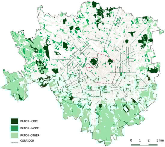 Then, the identification of the key components of the green network is performed, and they are classified as corridors, core patches, nodes, and other areas according to their spatial configuration, their surface extension, and their capacity of providing ESs, as shown in Figure 2. The result is the green matrix of Milan, i.e., the mapping of the UGI according to the concept of green networks (Figure 3). It highlights the ecological value of green corridors, green rings, peri-urban agricultural areas, and large urban parks as structural elements of the GI, with a number of additional spaces complementing the major areas. This preliminary mapping of the UGI consistent with the network approach has been performed while considering the entire urban area of Milan, as it is functional to highlight the effectiveness of this approach in identifying the main features of the UGI at the urban scale, but it results in a limited grasp of the specific situation of the historic center. Here, only two core patches can be recognized, namely Parco Sempione and Giardini Indro Montanelli, whose relevance mostly regards the recreational offer. The other green areas are classified as nodes because of their location in the downtown district, but most of them are actually smaller than 10,000 m2. Following the results obtained through this protocol and based on the mosaic model and green network concept, we obtain that the historic center is hosting a very limited number of key components of UGI. This is true if we only consider the large-scale components of nodes, patches, and corridors as part of the UGI. However, this analysis is not exhaustive, particularly where green areas are more fragmented and are at a smaller scale. Therefore, it becomes necessary to move to a more detailed spatial analysis level.