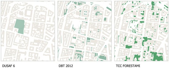 In this regard, the two additional data sources of DBT and TCC play a fundamental role in refining the identification of green elements and complementing the identification of the main network with an understanding of the system of green fragments. The comparison among DUSAF, DBT, and TCC in providing an exhaustive image of urban greenery is presented analytically in Table 2 and visually in Figure 4.