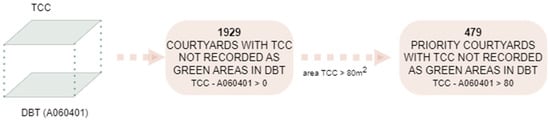 Thus, to proceed further with the mapping of green fragments, an assessment of the current situation of private open spaces has been performed. Within the study area, private open spaces mainly consist of courtyards inside the urban blocks and cover an area of 1.6 km2, which corresponds to 19% of the entire area of the historic center []. This percentage also includes already green and non-transformable areas. Out of the 6302 private open spaces registered in DBT, the result is that about one-third hosts at least one tree (from the intersection with the TCC layer) and about one-fourth is at least partially registered as green area (from the DBT layer A060401). The distribution of the recorded greenery among the private open spaces is schematized in Figure 6.