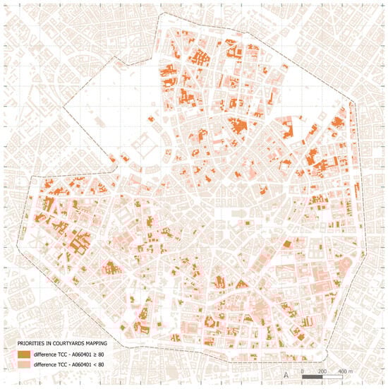 By subtracting the green areas already registered by the DBT from the TCC area, 1929 courtyards are identified where the presence of trees is recorded by TCC but the DBT does not register any green area. Selecting only those courtyards with more than 80 m2 of difference in green coverage, 479 courtyards are identified, where it is a priority to conduct in situ verifications to correct and integrate the DBT mapping. Figure 8 shows the two levels of priority for the verification and integration of the green mapping in DBT. This outcome can be used to update the two main tools currently in use for the identification of the UGI in Milan, namely Level 06 of the DBT and Sheet D03 of the planning document of PGT Milano 2030 (PGT DdP D03), which reports the municipal ecological network (Rete Ecologica Comunale—REC) and is used to support transformation and planning processes.