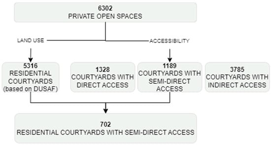 Figure 9. Selection process of private open spaces for the design and implementation of the green fragments strategy.