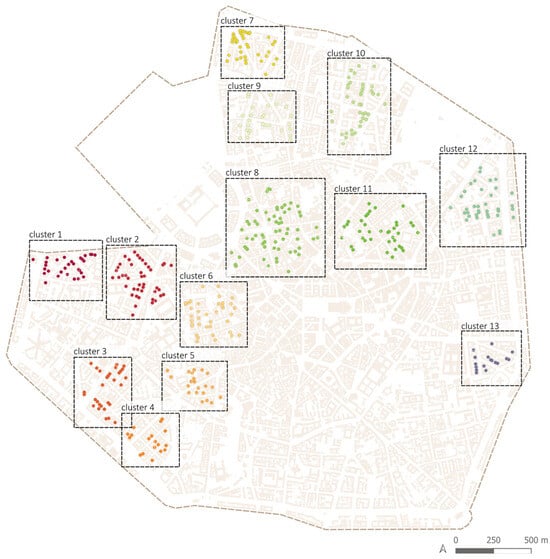 Moving on to the design and implementation phases, the proposed integration involves introducing the fragment approach into the strategic planning of the UGI. This intends to complement the existing program of major interventions focused on large public areas with an additional program of minor interventions to be carried out, including private spaces, inner courtyards, and other discontinuous urban spaces. To practically implement this approach into Milan’s UGI strategy, a selection and prioritization of intervention areas have been carried out. Firstly, based off the potential areas identified by the FORESTAMI project [], the scope of intervention has been limited to residential areas, following the DUSAF6 classification. Secondly, a selection criterion based on accessibility was added, and spaces with semi-direct access (with vehicular access from the street) were chosen. Green fragments may be identified in areas with non-residential uses and in non-accessible spaces, but these filter criteria are intended to maximize the real possibility of including the green fragment system in an overall vision of UGI. In practical terms, this choice led to a reduction in the number of private open spaces from 6302 to 5316 residential spaces and then to 702 considering the possibility of semi-direct access, as shown in Figure 9. Thirdly, to ensure the connectivity of green fragments system, parameters for quantity and proximity were set to identify clusters of courtyards in the urban fabric where coordinated interventions can have a greater impact. Clustering was constrained by a minimum number of elements per cluster, set at 15, and a maximum distance between elements within the same cluster, set at 150 m. These parameters were established based on various experiments to optimize the number of clusters identified in the study area and encourage the grouping of courtyards in adjacent buildings. The result of the clustering operation resulted in 13 groups of courtyards (Figure 10), including 442 courtyards in total and covering an overall area of 110,663 m2.