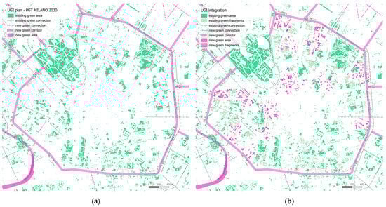 Figure 11. Complementarity of green network and green fragments approaches: (a) the current UGI program of PGT Milano 2030 surrounds the center but does not fit into it due to the spatial incompatibility of large-scale solutions in the compact urban matrix; (b) the proposed system of existing and potential green fragments complements the main network by ensuring good integration into the morphology of the historic center.