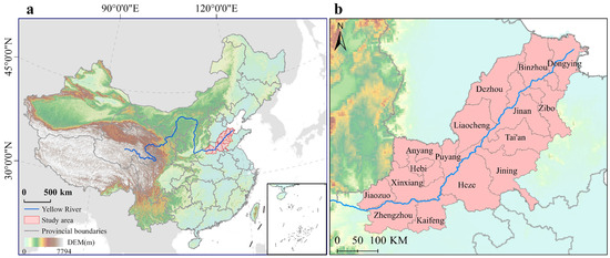The Lower Yellow River flows through the two provinces of Henan and Shandong, starting from Zhengzhou of Henan in the west and ending at the estuary of Dongying of Shandong in the east. There are 16 cities and 149 counties and districts along the downstream, covering a distance of 786 km, with a total area of 194,700 km2 [33]. The topography of the study area is complex. The Yellow River forms the famous “Hanging River on the Ground” in Henan Province due to the large amount of sediment it carries [34,35], and then enters the sea in the Dongying delta via the northern side of the Luzhong Mountains in Shandong Province (Figure 1). The Yellow River Basin serves as China’s main food production base, and the region is densely urbanised and populated, but with a relatively weak economic base. In the past two decades, rapid urbanisation has promoted the expansion of urban construction land and the agglomeration of non-agricultural population [36]. However, irrational human development activities have led to a decline in cropland quality, land salinisation, and wetland destruction, further weakening the stability of the ecosystem. The contradiction between human beings and nature is becoming more and more prominent [37].