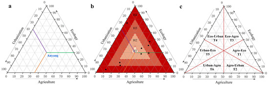 Interpretations of (a) the ternary diagram, (b) the determination of the degree of “Agro–Urban–Eco” development coordination, and (c) the six different development preference categories in the case of Anyang.