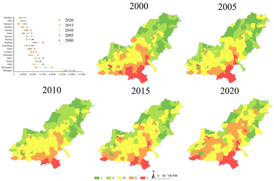 To demonstrate the spatial distribution pattern, we used the natural breakpoint method to classify the HQD of the counties into five classes, from low to high: I, II, III, IV, and V. In 2000, there were 27, 40, 45, 23, and 14 counties at levels I, II, III, IV, and V. Level I was mainly distributed in LiJin County in Dongying, Linzi District in Zibo, Wucheng County in Dezhou, and Xintai City in Tai’an. Level V was distributed primarily in Yucheng and Liangyuan counties in Shangqiu City and scattered in the Jinshui District of Zhengzhou and the surrounding area of Yutai County of Jining. From 2000 to 2010, the HQD of counties declined significantly, with V-level counties shrinking from 14 in 2000 to 9 in 2005, and only 4 counties reaching the V-level in 2010. It is noteworthy that Yongcheng, Xiayi, and Suoyang in Shangqiu City were always at level V during the study period. After 2015, the improvement of HQD in counties within the study area showed a trend of spreading from south to north and west to east. By 2020, there were 24, 24, 53, 35, and 13 counties in levels I, II, III, IV, and V, respectively (Figure 3).