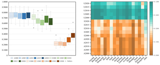 The development level of the cities along the Lower Yellow River urban agglomeration is quantified from three dimensions: agriculture, urban, and ecology, respectively (Figure 4). Overall, the value of agriculture in the five periods of 2000, 2005, 2010, 2015, and 2020 was 0.7312–0.7546, showing a fluctuating and slightly decreasing trend. The values of ecological function were 0.7044, 0.6412, 0.6217, 0.6889, and 0.6464, showing an initial decline followed by an increase. The urban function values were 0.2269, 0.2230, 0.2120, 0.2910, and 0.3785, rising rapidly after bottoming out in 2010. At the municipal level, Shangqiu, Kaifeng, Heze, Liaocheng, and Puyang have better agricultural functions, while Dongying, Zibo, and Jinan have worse agricultural functions. Among these, Zhengzhou, Jining, and Dongying exhibited a more pronounced decline in agricultural function. The ecological function of all cities except Dezhou declined. In 2020, Shangqiu, Xinxiang, and Jiaozuo had the highest ecological functions, and the lowest values were distributed in Jinan, Dongying, and Binzhou. Regarding urban functions, Zhengzhou experienced the most significant increase during the study period and reached the maximum value in the study area in 2020. In contrast, the urban functions of Dezhou and Binzhou showed little improvement over the study period and are well below the average.