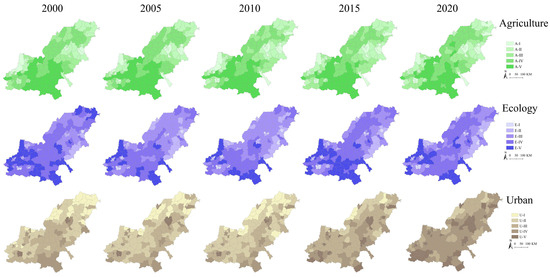 In order to better demonstrate the functional distribution and change trends of counties, we used the natural breakpoint method to classify them (Figure 5). In terms of agricultural functions, there were 3, 15, 35, 50, and 46 counties in 2000 from the lowest to the highest rank. Among them, the high grades were mainly distributed in Yongcheng, Xiayi, and Lankao in the south. In contrast, the low grades were primarily distributed near the estuary of the Yellow River, such as Wudi and Kenli. Over time, the agricultural functions in the study area showed a significant quality decline, with a significant increase in A-I and a sharp decrease in the intermediate grades III and IV. Spatially, the area showed a decline in agricultural function in the south and an increase in agricultural function in the north. Notably, Licheng District in Jinan and Zichuan District in Zibo are located in grades A-V, but their surrounding counties show a cascading and spreading decline in agricultural function. As of 2020, the agricultural function classes ranked from lowest to highest included 11, 19, 31, 40, and 48, respectively.