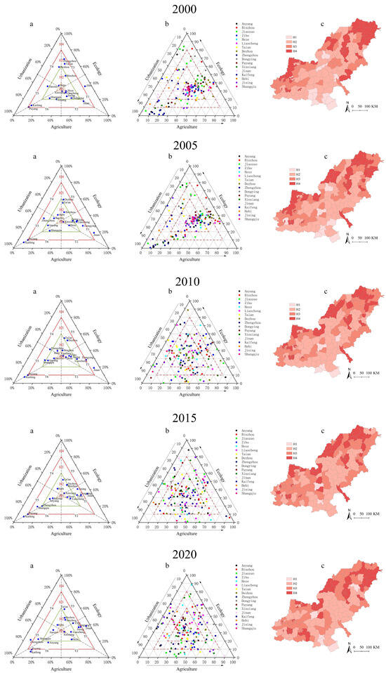 Through the presentation of ternary diagrams (Figure 6), we identified their development function preferences and DC degrees at the city and county scales, respectively. At the municipal level, the number of cities with a DC rating of H1-H4 in 2000 was 0, 9, 7, and 1, respectively; the number of cities in the four levels of H1-H4 in 2020 was 1, 6, 6, and 4. The rank shows a significant divergence in the DCs of the cities, with significant polarisation. In 2000, there was only Zibo in H4, but by 2020, H4 had increased to four, including Jinan, Dongying, Kaifeng, and Zhengzhou. Of these, Zibo’s DC grew steadily after entering H3 in 2005, while Jinan’s and Kaifeng’s DC continued to decline and ultimately stayed at H4. It is worth noting that in 2000, Hebi, Xinxiang, and Liaocheng were all close to H1, but ultimately only Xinxiang entered the H1 range. All other cities hovered between H2 and H3, with no dramatic changes in DC rankings.