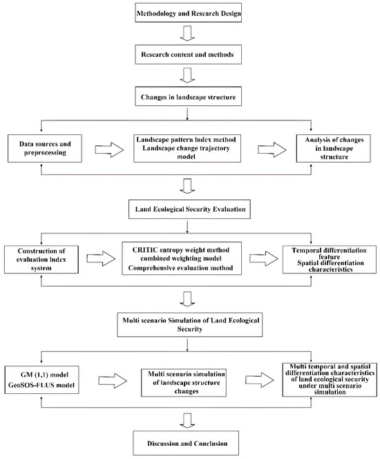The ecological integrity and safety of the YRD are discussed with regard to landscape composition, and research is conducted according to the subsequent steps. First, data are required to study the landscape framework change of the YRD utilizing landscape pattern metrics and the landscape change trajectory model. Secondly, the framework of land ecological security assessment is established, and the temporal and geographic distribution patterns of ecological stability within the YRD are examined by utilizing a combined CRITIC–entropy weighting model and a holistic appraisal technique. Subsequently, the GM (1,1) model and the GeoSOS-FLUS model are utilized to recreate multiple scenarios of LES in the YRD, describing the spatiotemporal attributes of LES across diverse scenarios. Finally, drawing on the aforementioned findings, the corresponding conclusions are drawn, and tangible recommendations are proposed to enhance ecological conservation and sustainable growth in the YRD (Figure 2).