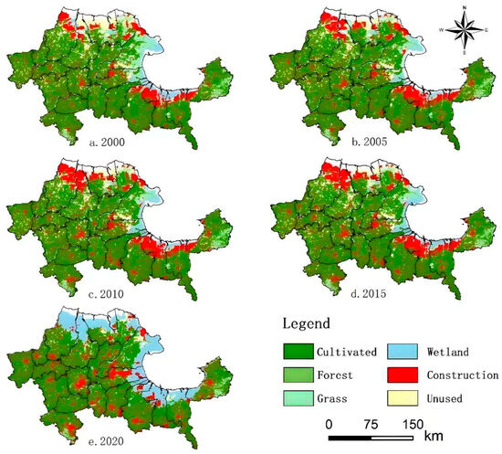 The overall attributes of the landscape structural alterations within the YRD between 2000 and 2020 are illustrated in Table 4 and Figure 4. The change in landscape structure in the YRD between 2000 and 2020 was primarily characterized by cultivated land, comprising over 60% of the entire surface. Construction land had an area ratio of 15% to 20%, followed by grassland and unused land. The expanse of cultivated land grew from 16,039 km2 to 16,536 km2 between 2000 and 2005, but decreased slightly after 2005 due to urban development and policies such as returning cultivated land to forests. Construction land increased by 24.5% between 2000 and 2015, but decreased to 4079 km2 in 2020. Its change trend is primarily due to the continuous replenishment of water supplies in the YRD wetland in recent years. This effectively promotes the natural restoration of the ecosystem in the lower Yellow River area, the YRD wetland, and the nearby sea area. Forest land saw a slow decline, with grassland and unused land decreasing. The wetland developed rapidly in 2015, forming the main natural corridor of the YRD.