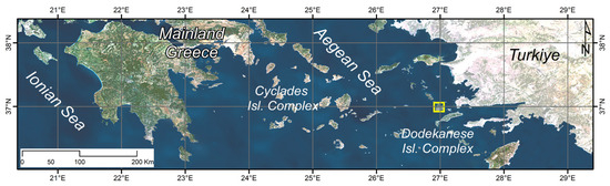 Index map of Kalymnos Island location (yellow rectangle) within the Aegean Sea.