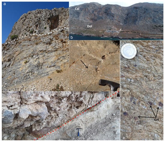 The most significant lithologies contributing to the steep geomorphology and hosting the climbing routes. (a) Upper stratigraphic section of the Marina cover Unit. Late-Jurassic–early-Cretaceous dark cherty limestone overlain unconformably by white to light grey massive late-Cretaceous limestone. (b) View of the climbing routes at the northern side of Arginonta Bay and the lower stratigraphic section of the Marina cover Unit. The smooth topography of the underlying dolomite (Dol) makes a stark contrast with the subvertical cliffs of the late Triassic limestone (Cal). (c) Late Permian fossils of Fusulinidae sp. (black arrow) in the white Permian marble of Kefala Unit. (d) View of the Detachment surface at northwest Kalymnos (red dashed line). The foliated cataclasite marks the south-dipping low-angle normal fault at the base of the Marina Cover Triassic limestone. (e) Garnet-mica schist of the Marina Basement Unit (black arrows pointing to garnet grains—Grt).