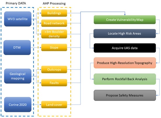 In this work, we describe the study of the rockfall risk in Kalymnos Island (Figure 1), with different techniques. The primary goal was to limit the areas requiring detailed integrated simulations, which was achieved by producing a vulnerability map for the entire island that highlighted the highest-risk zones. We merged the resulting outcomes from (i) classical geological field mapping, (ii) the interpretation of high-resolution satellite data (WorldView-3 satellite images) for locating the spatial distribution of boulders but also for tracing the contemporary land cover, (iii) the integration of geoinformation data through an analytical hierarchy processing (several layers of induced spatial information have been constructed and correlated with each other within a GIS platform), (iv) close-range remote sensing campaigns with Unmanned Aerial Systems (the construction of more than a dozen of 3D models at the highest risk areas), and (v) an integrated simulation of rockfall events (sophisticated parametrization of software providing the analysis of different scenarios producing rock dispatches).