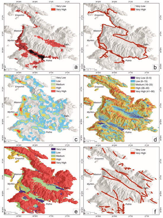 Slope: Topography is considered one of the critical factors that affect landslides and rockfalls [54] as it controls the shear forces acting on the relief. Gentle (low gradient) slopes are expected to decrease the risk of rockfalls to zero, whilst steep (high gradient) slopes are expected to increase the risk of rockfalls to high. Kalymnos is an area of high steepness where the slope can reach almost 90 degrees. The slope angle was modeled using a grid-based DEM and was classified into five classes related to risk; (a) very gentle slopes of 0–5° as “Very low”, (b) gentle slopes of 6–15° as “Low”, (c) moderate steep slopes of 16–25° as “Medium”, (d) steep slopes of 26–40° as “High”, and (e) very steep slopes of 41–90° as “Very high” (Figure 8d).