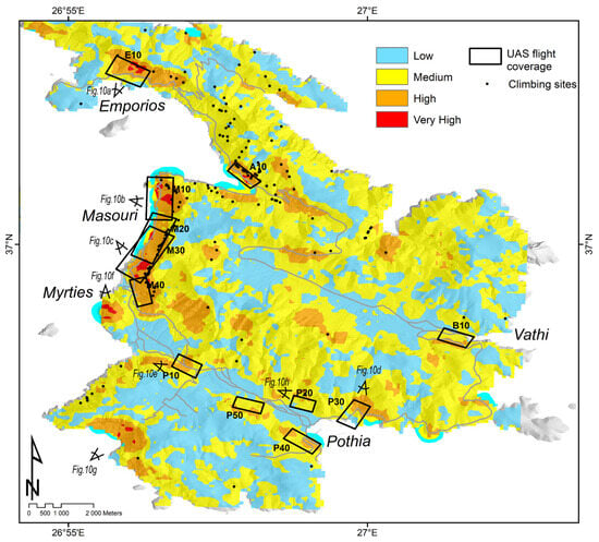 Vulnerability map for the island of Kalymnos regarding the rockfall risk. Red and orange colors define the “Very High” and “High” risk areas. The field validation showed an impressive relationship with reality. Note the photograph locations and angles of Figure 10. The black rectangles show the coverage of a detailed study with close-range remote sensing using UAS (see Table 2), whilst black dots represent the sport climbing sites.
