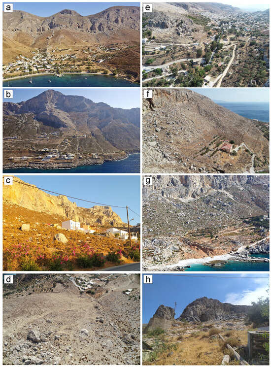Aspects of the most characteristic “Very High” rockfall risk areas as they have been spatially calculated through vulnerability map generation (see Figure 9 for locations). (a) Subvertical cliff and large boulders uphill from the residences. (b) Large boulders are hanging over residences, with some already situated among them. (c) Closer look of numerous large boulders among residences. (d) A top-down view from the cliff reveals fallen boulders scattered down the slope, some tumbling toward the residences below, appearing dangerously close to impact. (e) View of the limestone bedrock collapse showing freshly fallen boulders breaking away from the cliff face. (f) Loose boulders slide down near residence. (g) Fallen boulders uphill the Holy Trinity monastery (south Kalymnos). (h) Steep cliff and poor measures right next to the edge of the town.