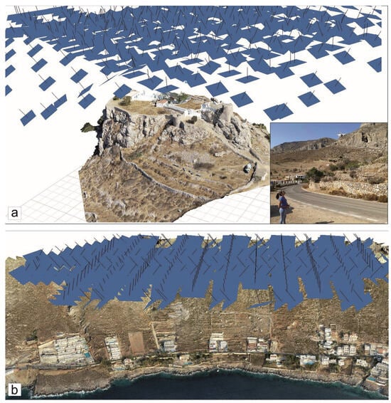 In the case of Kalymnos Island and taking into consideration the large dispersion of the climbing sites, which cover relatively small areas, the demand to focus on very localized disastrous phenomena has led to the constantly increasing need for very-high-resolution topography data. Consequently, the generation of ultra-high-density point clouds, which include the elevation information followed by the earth’s surface color data that are, in turn, used to construct Digital Surface Models (DSMs) and Ortho-photo-mosaics, became more than necessary. We utilized close-range remote sensing data acquired from UAS and high-resolution satellite imagery, which have been widely used in hazard mapping and risk assessment concerning floods [23], forest fires [24], soil erosions [25,26], rockfalls [27,28], etc. Most frequently, they are involved in several stages of data processing, especially when mapping steep-slope landscapes, which contain geological structures commonly exposed to natural geomorphic mechanisms such as erosional processes and, by extension, to landslides and rockfalls, posing safety hazards to people and infrastructure [29]. Considering the challenging, inaccessible terrain of Kalymnos and the need for dense field measurements to achieve reliable statistical analysis, traditional surveying methods with a standard geological compass are difficult to apply, underscoring the importance of close-range remote sensing techniques [30,31,32,33].