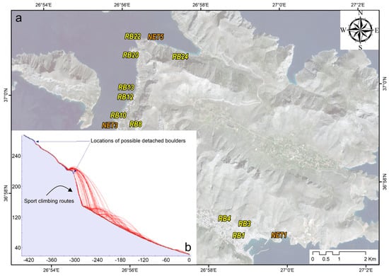 The application of the described methodology covering the entire onshore area of the island seems to delineate its most vulnerable parts to rockfalls, saving precious time for integrated simulations and designing safety measures. These can be applied to several locations on the island and are focused on preventing rockfalls from producing infrastructure damage. In general, conventional methods such as mesh and cable nets, as well as barriers, can prevent rocks from reaching manmade constructions (Figure 12). The latter would be established to keep the boulders from reaching the infrastructure in cases that the slopes—as a potential source of rockfalls—are being used as climbing sites, whilst nets would be installed at vulnerable slopes that are not used by climbers. Concerning the climbing sites that fall in the high-risk areas, it is recommended that they be systematically monitored and characterized with signs that inform the climbers of the dangerous rock failures that could cause further rockfalls.