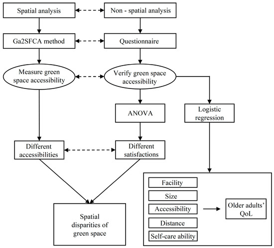 Both spatial and non-spatial analysis methods were adopted to primarily investigate the relationship between the accessibility of green spaces and the QoL of older adults, as illustrated in Figure 1. The Ga2SFCA method was used to measure the spatial accessibility of green space from older adults’ perspectives. In order to verify the results of spatial accessibility, a questionnaire was applied to examine older adults’ subjective responses to the accessibility of green space. Spatial disparities of green space were expected to be measured by both objective spatial analysis and subjective non-spatial analysis. The impact of accessibility of green space on older adults’ QoL was then investigated by logistic regression by using questionnaire data.