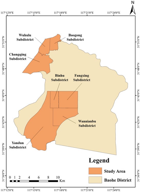 In order to investigate the impact of the accessibility of green space on older adults, a typical mega-city, Hefei, with an aging population proportion over 10% was selected. Hefei (116°41′–117°58′ E, 30°57′–32°32′ N) is the capital city of the Anhui province of the Yangtze River Delta. It is also a national science and education center, manufacturing base, and integrated transportation hub of Eastern China. The resident population of Hefei was over 9.4 million in 2021, and the population of 65-year-olds and above was more than 1.12 million (i.e., accounting for 11.91% of the entire population). In this research, we used Baohe district (117°18′ E, 31°47′ N), one of four administrative districts in Hefei, as a case study area (Figure 2). The population of Baohe district is the biggest in Hefei, standing at 1.42 million. There are two national model aging-friendly communities in Baohe district. Moreover, green space in Baohe district is a plentiful resource. Per capita green space reaches 14.7 m2, which is the highest in the entire Yangtze River Delta. Around Chaohu Lake, there are over 80 km2 of ecological wetlands and 16.8 km of lake shorelines. There are 13 subdistricts in Baohe district. The research team administered questionnaires in seven of the subdistricts (Baogong, Wuhulu, Changqing, Binhu, Fangxing, Wannianbu, and Yandun), where most of the aging population is distributed (Figure 3).