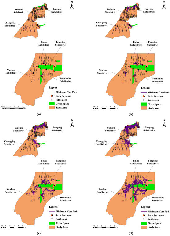 Distances between residential communities of older adults and green space. (a) Threshold Walking Distance of 500 m; (b) Threshold Walking Distance of 1000 m; (c) Threshold Walking Distance of 1500 m; (d) Threshold Walking Distance of 2000 m.