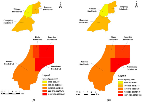 Distances between residential communities of older adults and green space. (a) Threshold Walking Distance ≤ 500 m; (b) Threshold Walking Distance ≤ 1000 m; (c) Threshold Walking Distance ≤ 1500 m; (d) Threshold Walking Distance ≤ 2000 m.