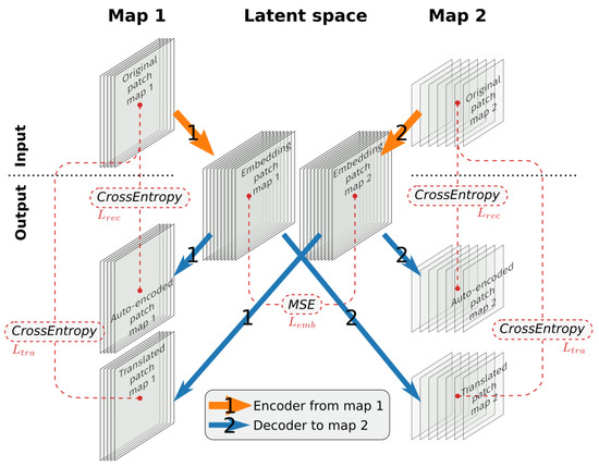 Artificial intelligence (AI) and machine learning (ML) have proven useful in increasing the resolution of land cover maps, with many of the latest land cover maps including some element of machine learning in the production process. For example, ESA WorldCover [11] uses gradient boosting, S2GLC [12] and ELC10 [13] use random forests, and ELULC [14] uses a multi-layer perceptron. In all of these examples, the machine learning methods are rather simple, and the greatest care is put on the feature engineering. Authors from that community usually have a remote sensing background, and their focus is mostly on the quality of the maps that they produce. Conversely, some other work, mostly stemming from the release of ML-ready datasets, such as BigEarthNet [15] or SEN12MS [16], design advanced deep learning architectures to perform land cover segmentation [17] or classification [18], while the feature engineering is not the main focus. Authors from that community usually have an AI background, and their focus is mostly on the performance of the architecture that they design. Ref. [19] has yet another approach that takes advantage of both existing land cover maps and modern AI architectures. Their main idea is to translate land cover maps: one-to-one [19] or n-to-n [20]. A very attractive feature of map translation is to bypass the remote sensing feature engineering. Indeed, remote sensing data can be complicated to process or have unequal coverage, which is even more critical when a training dataset has to be constructed. In [19] they use a truncated convolutional U-Net trained with a Dice loss to translate one land cover map to another. The difference in resolution between the two maps is dealt with thanks to the truncation of the U-Net, which makes it difficult to reuse the method with other maps. In [20] they use one convolutional auto-encoder per map, trained to minimise a combination of losses. This ensures that the latent space is common to all maps, which enables n-to-n map translation and proved to be more efficient than one-to-one translation. The n-to-n map translation [20] is the approach that is followed in this paper, as it is the most successful method to perform map translation.