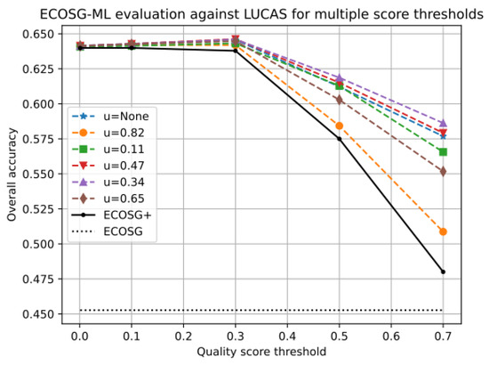 Figure 5 was obtained as described in Section 3.5. It shows the evolution of the overall accuracy against LUCAS obtained for different threshold values in the merging process (see Section 3.3). The coloured dashed lines each correspond to a member of ECOSG-ML, and they are identified by the value u used in the inversion of the CDF (see Section 3.4, the value None corresponds to the control member). The black solid line corresponds to ECOSG+ when we take different values for the threshold (see Equation (12) in [25]). The black dotted line corresponds to ECOSG (which is flat because it does not depend on any quality threshold).