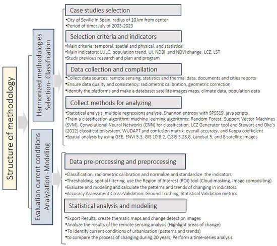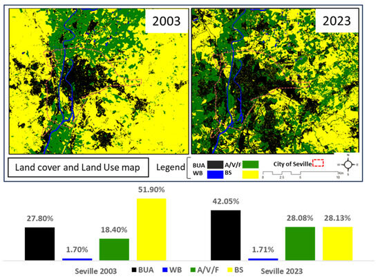 Therefore, this research aims to systematically review and evaluate the existing data linked to LULC, LCZ, and UI and investigate the adverse environmental impacts of urban growth, particularly in long-term local climate change patterns in Seville, Spain. It examines two decades of LULC distribution and changes, the types of urban growth, and UI patterns and density and evaluates LCZ changes, population trends and flow, and their effect on LST variations from 2003 to 2023.