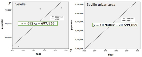 In the following section, based on linear model in SPSS.19 for the specified multi-year interval, the growth rate and population trend in the city and a comparison within the urban area was evaluated (Figure 7). The results show, in total, both the city and urban areas have positive growth rates; the growth rate in the urban area is almost 15 times bigger than that of the city. This finding indicates that the urban area (metropolitan area) is migrant-receptive, as there was a significant increase in the population and the direction of population movement was from the city to urban areas and suburbs. Seville acts as a source of migrants [8,51,59]; therefore, urban areas have experienced a considerable increase in population and physical growth. This phenomenon can prove the types of urban growth in the past, present, and future of the study area, which are explained in Figure 4 and Figure 5. As mentioned before, these items were the main factors that indicate there is a need for analyzing not only the city but also the surrounding area because they have an effect on the pattern of changing in all of the evaluated indicators.