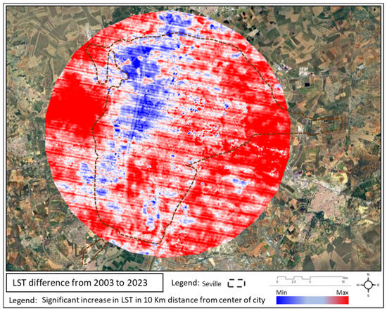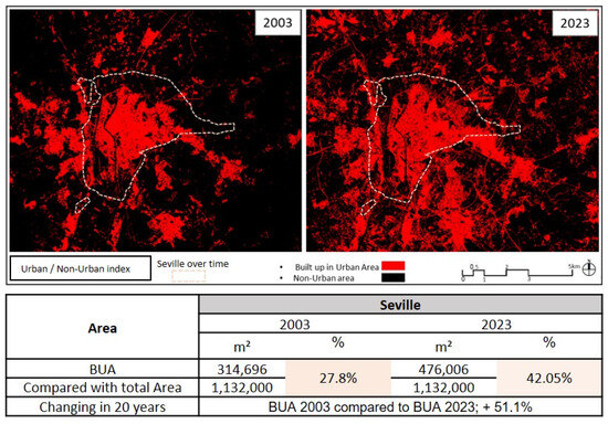 This study meticulously examines the various facets of urban growth in Seville, incorporating insights from contemporary urban studies and previous plans, programs, and projects to provide a comprehensive overview of Seville’s urban growth trends and their climatic ramifications from 2003 to 2023. Based on findings from previous research and under the new General Urban Development Plans (1988, 2006, and 2018), the process of urban growth in the previous century was influenced by various internal and external factors [5,8]. Some World Exhibitions and national and international events and projects, such as the Ibero-American Exposition 1929–1930 (from 1015 to 1029, 36.19% increase in BUA) and the World Exhibition—EXPO’92 (from 1981 to 1992, 40.79% increase in BUA) [53], had a huge effect of shaping the context of the city in 21 centuries. By examining the city’s structure, Seville shows an ecological design with a central urban area and radial growth, in which newly developed areas are gradually integrated over several years [57].