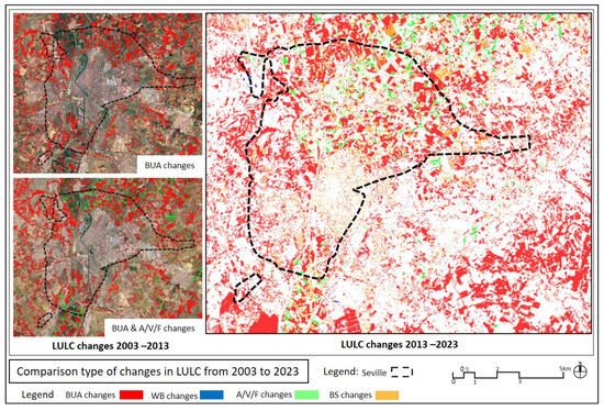 • LULCC: Change detection entails comparing two or more images acquired at different times to identify and analyze changes in the landscape [12,38] and the context of the urban area, which is identified by different colors for the BUA levels for cities, villages, roads, industrial areas; WB levels for rivers, canals, and swamps, A/V/F area; and BS [4,9,12]. One common method for LULC change detection involves computing the LULC for each period and then subtracting one from the other [8]. For a given land cover type (e.g., urban), the area can be calculated using the formula in Equation (1).