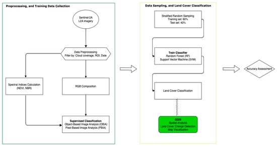 This section outlines the step-by-step approach (Figure 2) applied to compare RF and SVM algorithms, with the processing primarily conducted on the GEE platform for land cover classification and burnt area recovery detection in the study area. The approach begins with data acquisition and pre-processing, followed by feature extraction using RGB composition and NDVI results. The feature collections are then processed with PBIA and OBIA for land cover classification. Subsequently, the samples are further split to train/test sets to train the classifiers for land cover classification in the ROI. The accuracy of the final land cover classification is assessed with evaluation metrics and validation techniques. The land cover maps with the highest accuracy are exported to QGIS 3.28 software for further spatial analysis, burnt area recovery detection, and map visualization.