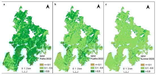 NDVI maps of the study area for (a) pre-wildfire 2022, (b) post-wildfire 2022, and (c) summer 2023. Computation was performed from Sentinel-2A data and classified according to the NDVI value range suggested by USGS.