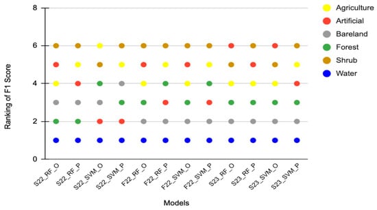 The F1 score was also used to evaluate the balances of the precision and recall values of the land cover classification generated by each model. Water achieved an F1 score of 1, indicating perfect precision and recall values in all models (Figure 5). This was expected as the spectral reflectance of Water is significantly different from other land covers. Regardless of the models, Bareland and Forest were classified precisely, especially in the RF × OBIA model (Tables S4–S6), where the F1 score was close to 1 in all events. The classification of Shrub achieved the lowest F1 score with the SVM × PBIA model in all events. While none of the F1 scores were higher than 0.634 with the SVM × PBIA model, the classification for Shrub, after the 2022 wildfire, achieved the lowest values of 0.3374, 0.2602, and 0.4798 for F1 score, precision, and recall, respectively (Tables S7–S9). Furthermore, Agriculture obtained the lowest F1 score with the SVM classifier in pre-wildfire events (Table S7) and as low as 0.6015 and 0.6151 for the OBIA and PBIA approaches, respectively. It is challenging to classify vegetation as the different types have very similar spectral reflectance [47]. Figure 5 presents the F1 score of the land covers according to their ranking in each model. Interestingly, OBIA and PBIA performed consistently with both RF and SVM classifiers in F1 score ranking for classification in post-wildfire 2022 and summer 2023. Hence, choosing the right classifier is vital to increasing land cover classification accuracy. Overall, RF had a relatively stable performance compared to SVM, as land cover classification accuracy using SVM fluctuated significantly among different scenarios. This was observed from the samples classified for Artificial, where high accuracy was achieved in the pre-wildfire event, while lower accuracy was attained in other events (Figure 5).
