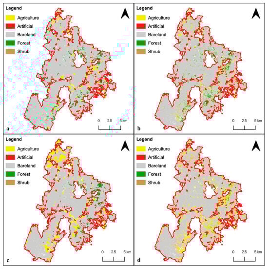 Figure 8 presents COSc 2023, where the study area was majorly recovered to Shrub with minor Agriculture and Forest regeneration while a smaller area of Bareland remained. Compared to the maps of Figure 9, land cover maps classified by the PBIA approach (Figure 9b,d) reflect the burnt area recovery and regeneration of forest more precisely. This is further confirmed by the land cover analysis presented in Table 8, in which the land size of Bareland and Forest classified by the PBIA approach is closer to the COSc 2023 classification than the land cover maps classified by the OBIA approach. Table 8 details that all models classified a much larger area of Agriculture and Artificial land and a much smaller Shrub compared to COSc 2023. Pertaining to the comparison of COSs 2023 with land cover maps of summer 2023, the SVM × PBIA map (Figure 9d) closely resembles COSc 2023 (Figure 8), except that the major Shrub area in COSc 2023 is classified as Agriculture on the map.