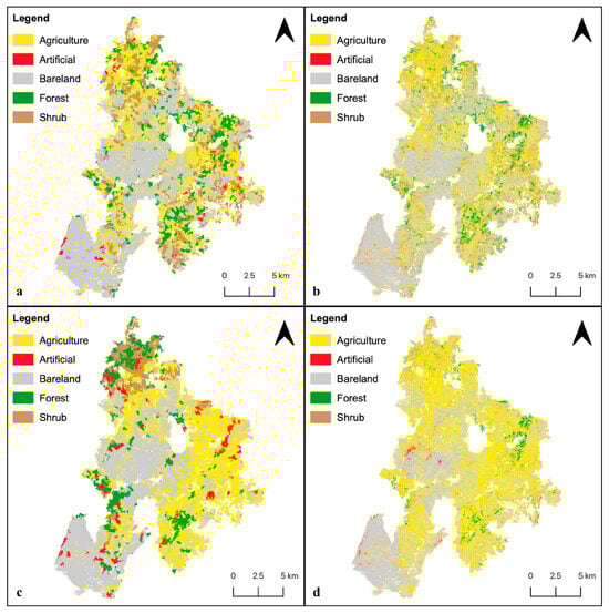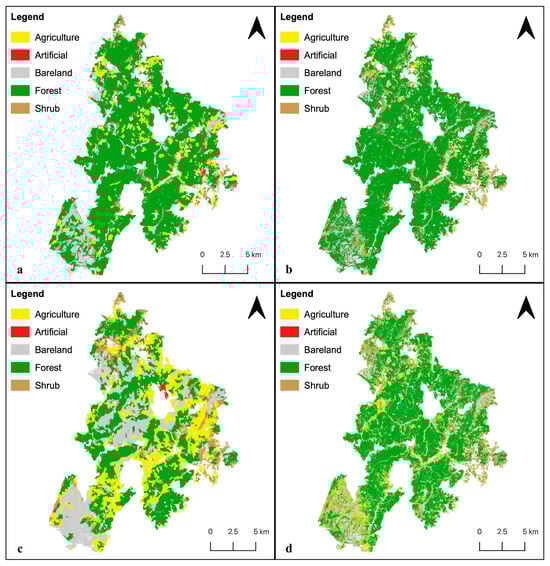 Comparison of land cover maps classified by different models: (a) RF × OBIA, (b) RF × PBIA, (c) SVM × OBIA, (d) SVM × PBIA for pre-wildfire 2022.