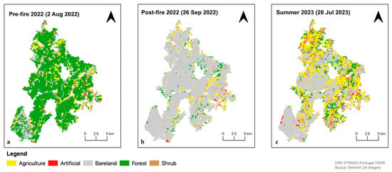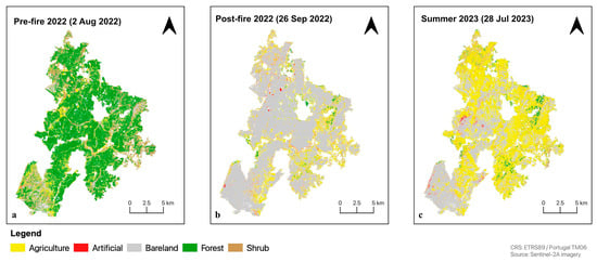 The land cover maps classified using the RF × OBIA model: (a) pre-wildfire 2022, (b) post-wildfire, and (c) summer 2023.