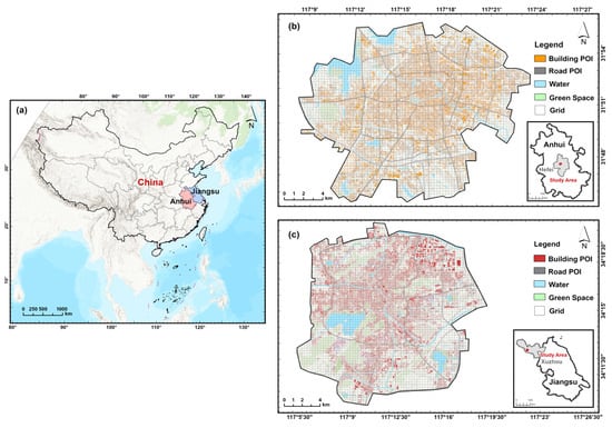 Since the selected datasets have different spatial resolutions, the two study areas, Hefei and Xuzhou, were divided into 300 × 300 m grid cells to ensure the accuracy and comparability of the analysis results, as shown in Figure 1b,c. This grid division allows for the integration of original data with varying spatial resolutions into a consistent spatial scale. Once the calculations for all indicators were completed, the data were extracted and aggregated based on this unified grid system, ensuring that all datasets were analyzed at the same spatial resolution. This approach not only eliminates errors that might arise from differences in spatial resolution but also improves the comparability between different datasets.