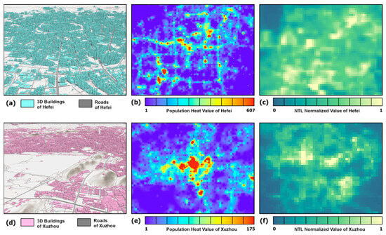 POI data for (a,d) buildings, roads, and (b,e) real-time population distribution, along with (c,f) NTL imagery for Hefei and Xuzhou.