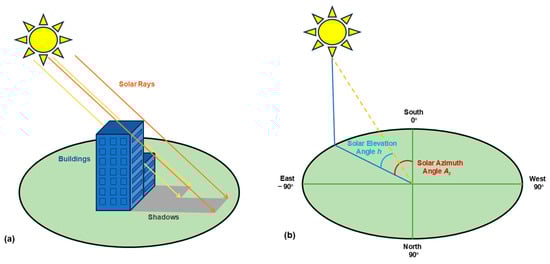 (a) The relationship between the spatial distribution of building shadows and solar illumination; (b) solar azimuth and solar elevation angle.