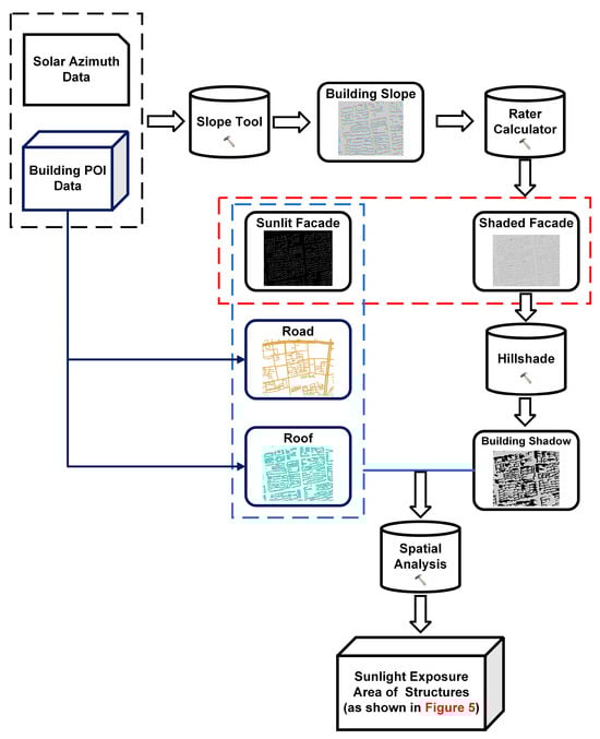 Due to the height differences and complex spatial layouts of buildings in urban environments, building shadows often cover parts of surrounding buildings or roads, preventing these areas from receiving direct solar radiation. This shading effect causes the temperatures in shadowed areas to be notably lower than those in areas directly exposed to sunlight. Therefore, in analyzing the urban heat island effect, the portions of buildings and roads covered by shadows are not considered positive contributing factors. To accurately assess the sunlight exposure areas of buildings and roads, this study employed a spatial analysis method based on ArcGIS, with the methodology flow shown in Figure 4.