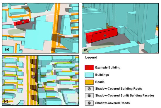 (a) Building roof sunlight exposure area extraction; (b) sunlit building facade sunlight exposure area extraction; (c) road sunlight exposure area extraction.